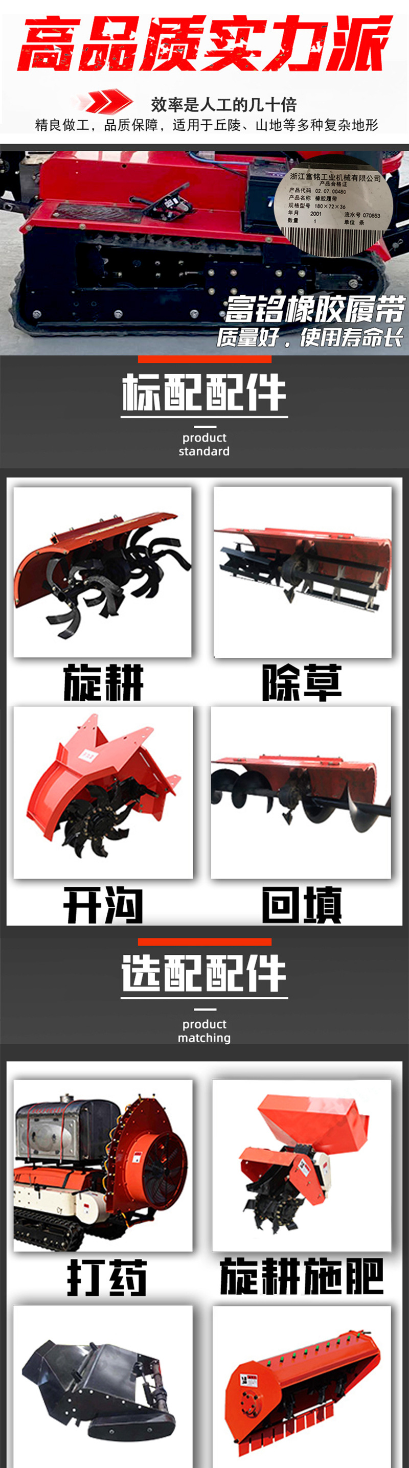 产品详情:该履带旋耕机构造简便,连贯,结实且精确,容易操作且灵巧马力大有着体积小和可传递性好的优点。十分合适各种现场管理操作。配备相应的农业机械及配件,可用以旋耕,泥土破碎和旋施作业,还配有自动控制设备,可对机械的升降和转向开展远程控制。未配备工厂的,用户可以根据需单独购入。